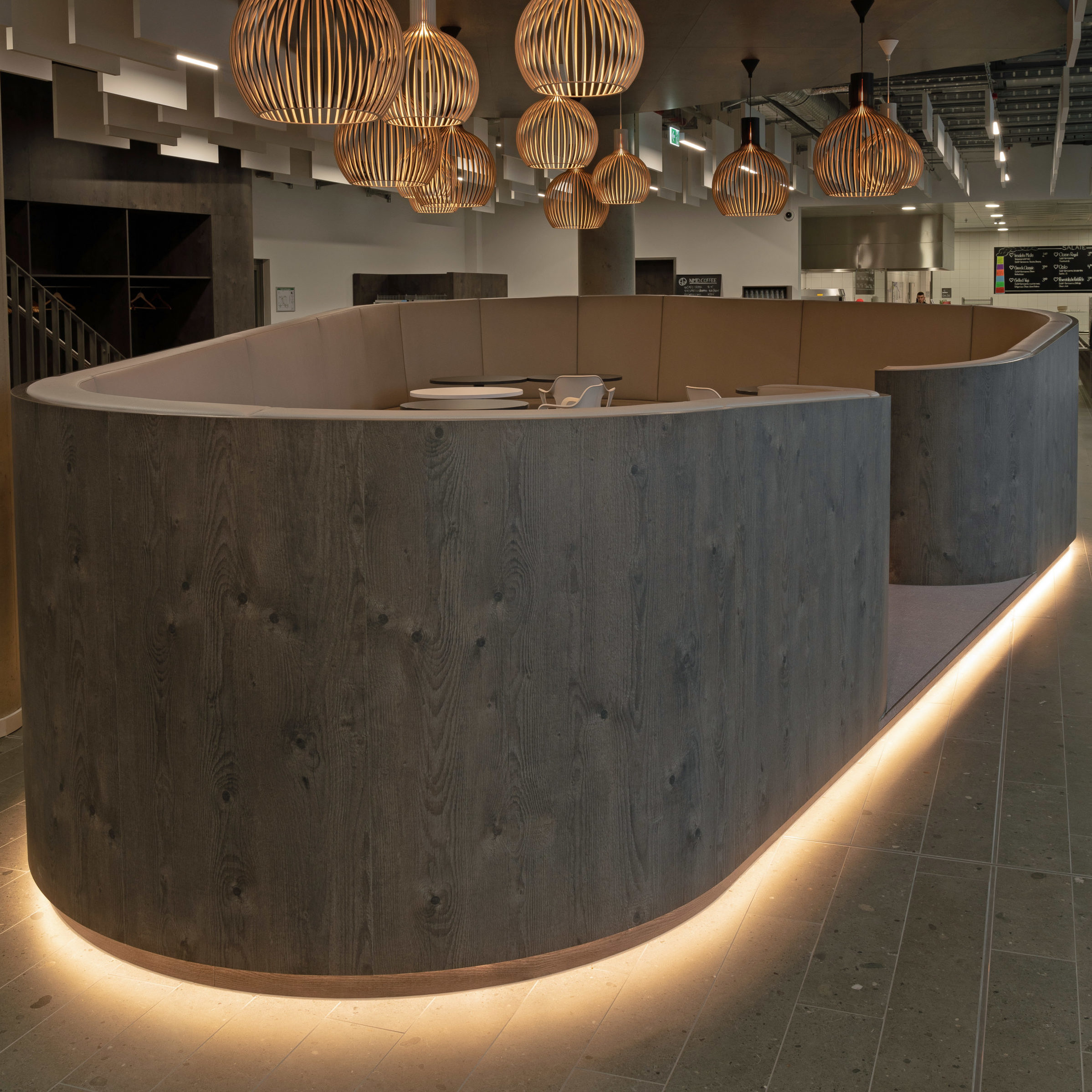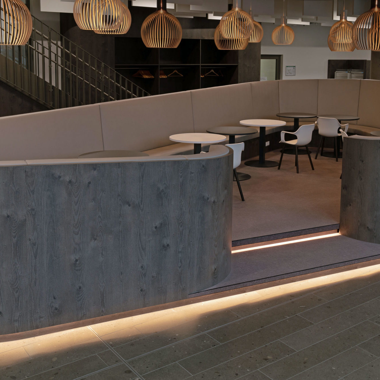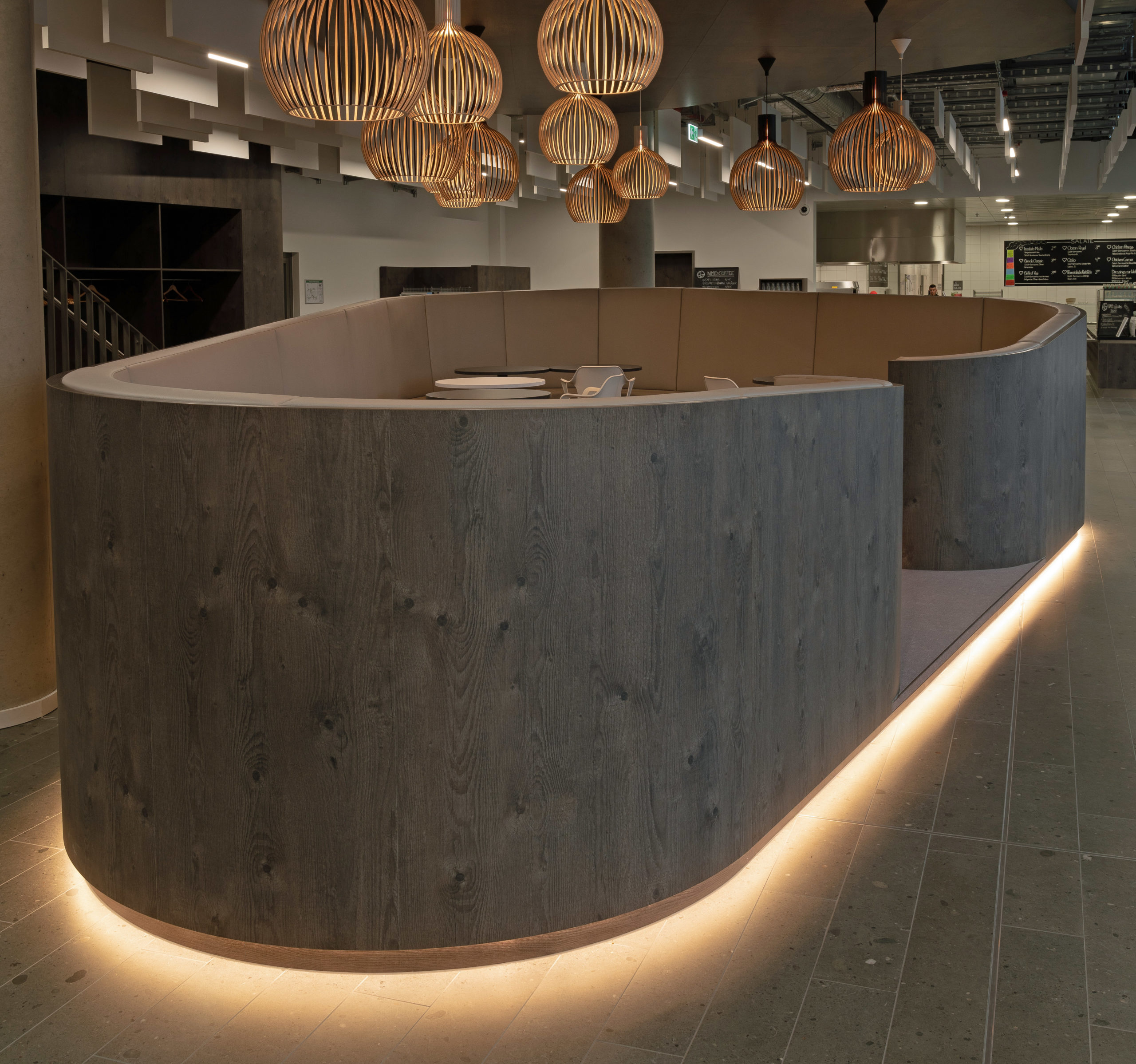 Für eine exklusive Sitzinsel fertigten wir die Holzformteile. Hierbei sind die einzelnen Segmente passgenau in der vorgegebenen Steigung formatiert.
