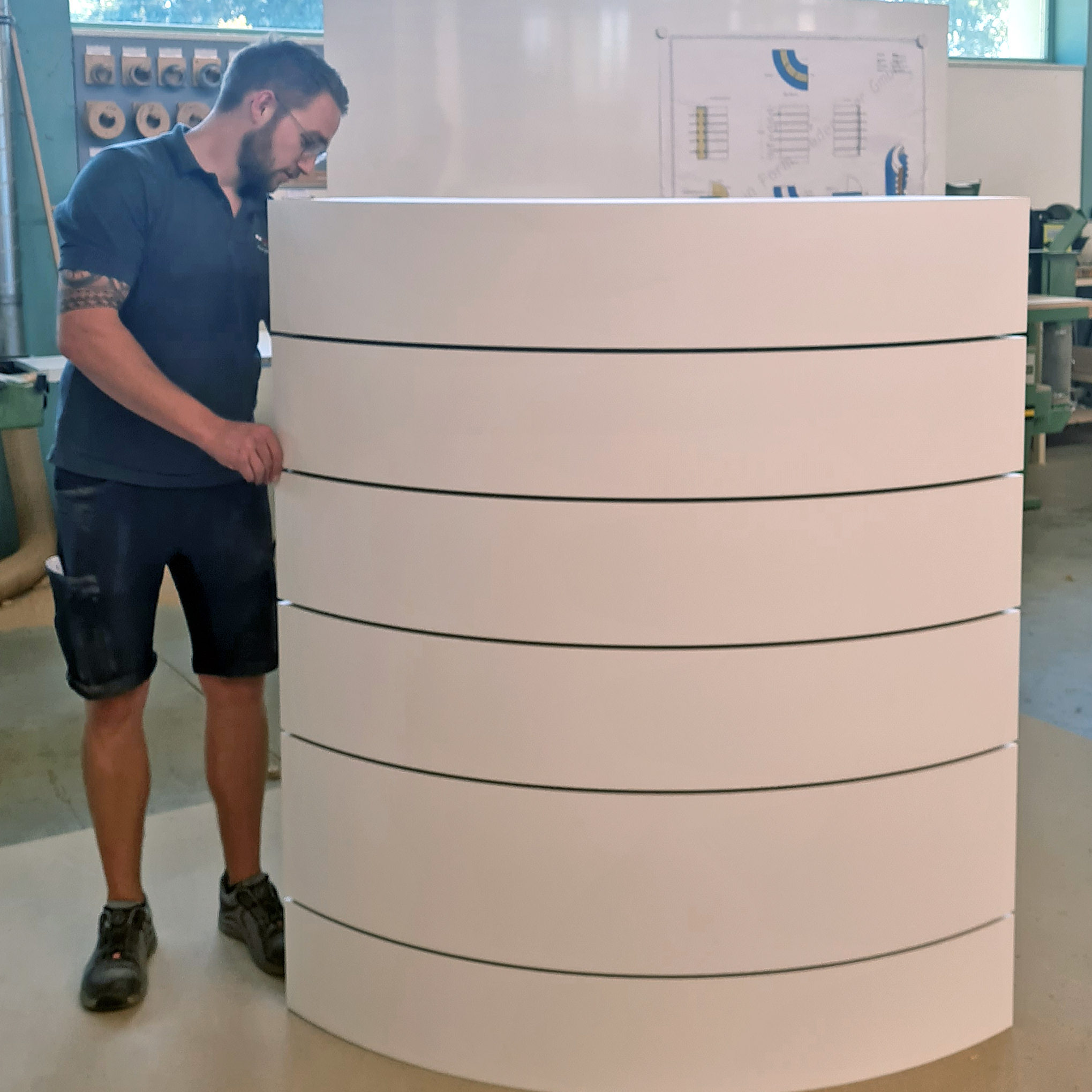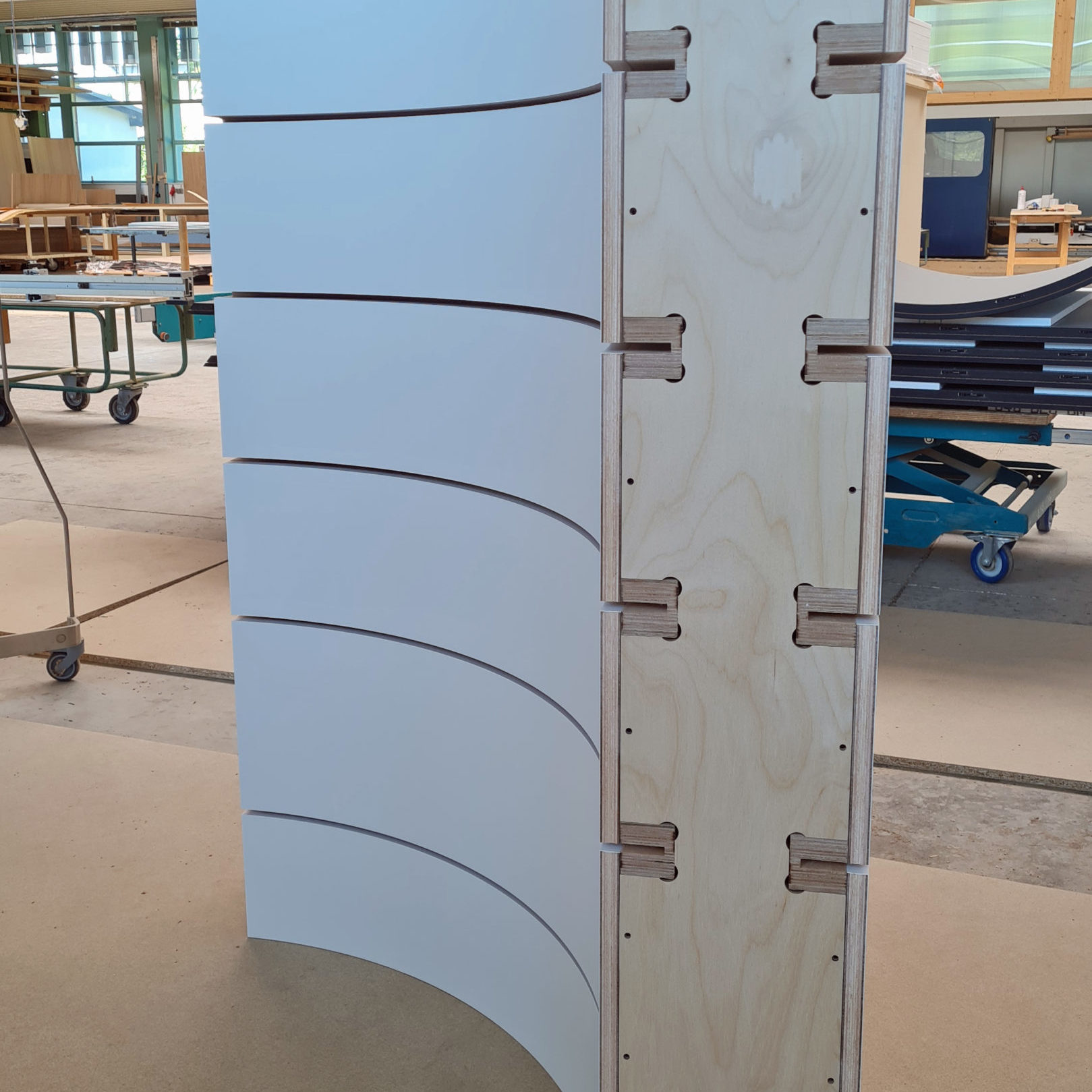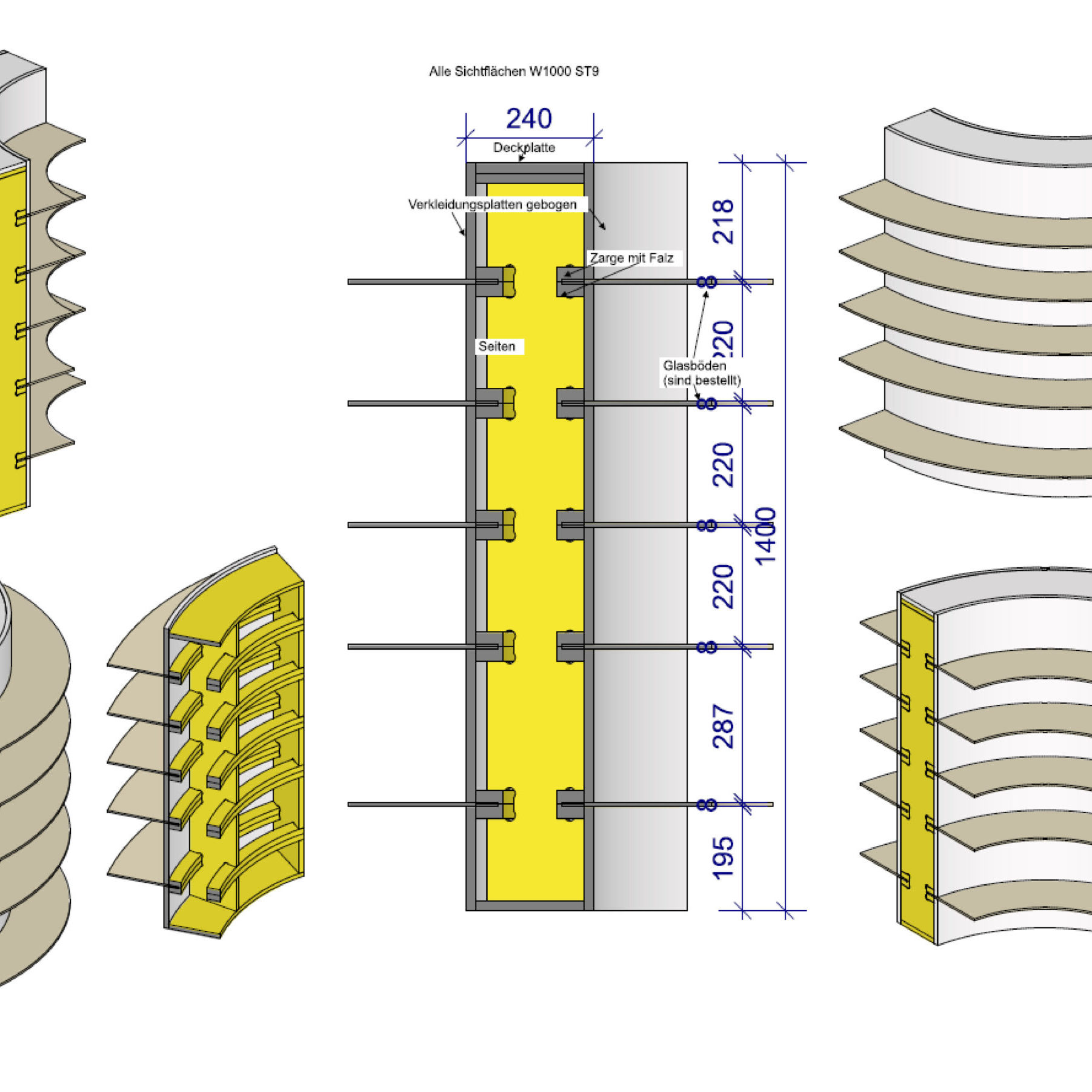 Wieder mal ein Blick in unsere Fertigung.Der freistehenden Warenpräsenter wurde nach Kundenwunsch soweit gefertigt, dass nur noch die Glasfächer eingeschoben werden müssen – und schon kann er dekoriert werden;