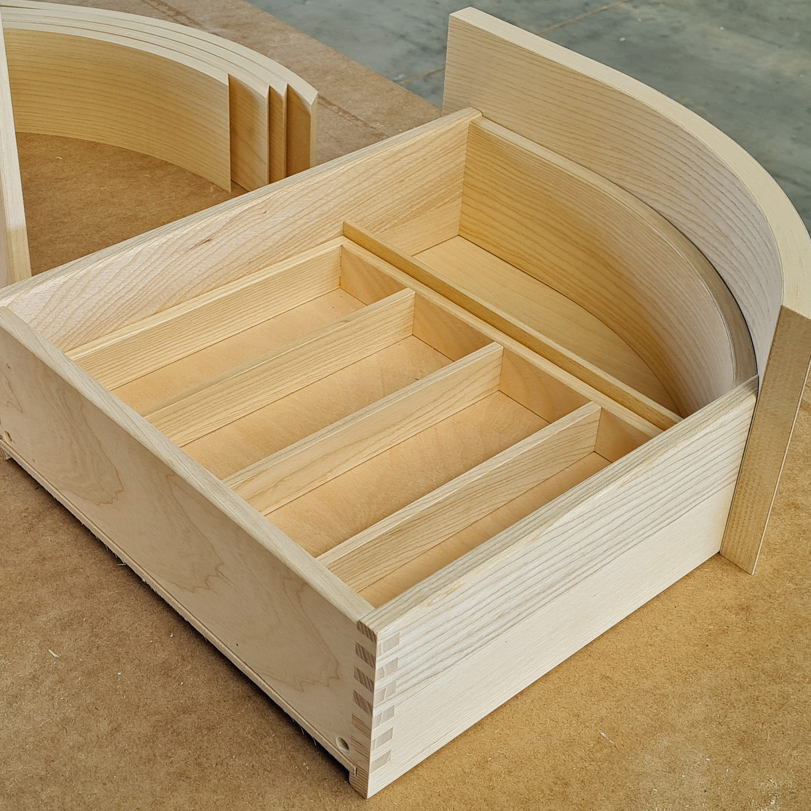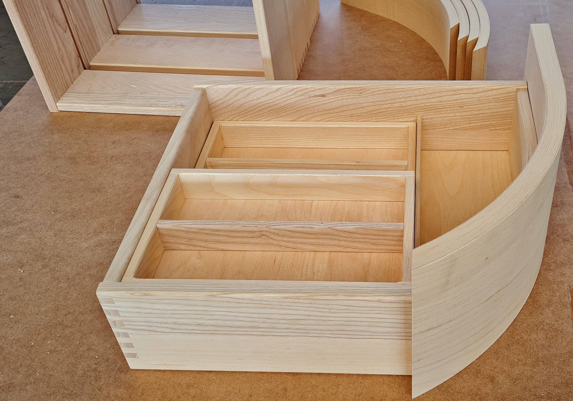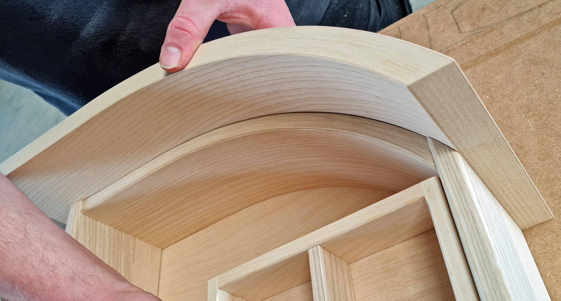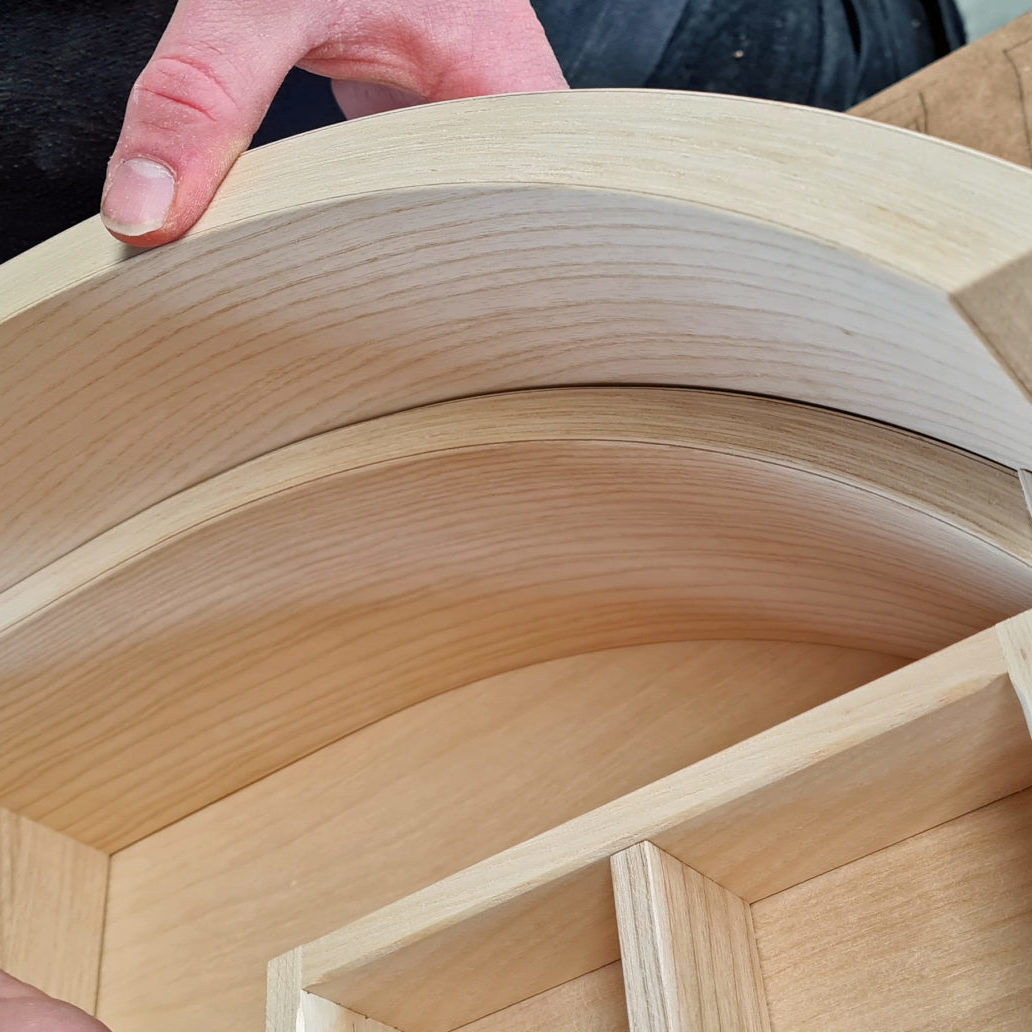 Holzviertelschalen verschiedenen Radien, Längen und mit und ohne Grundierfolie.