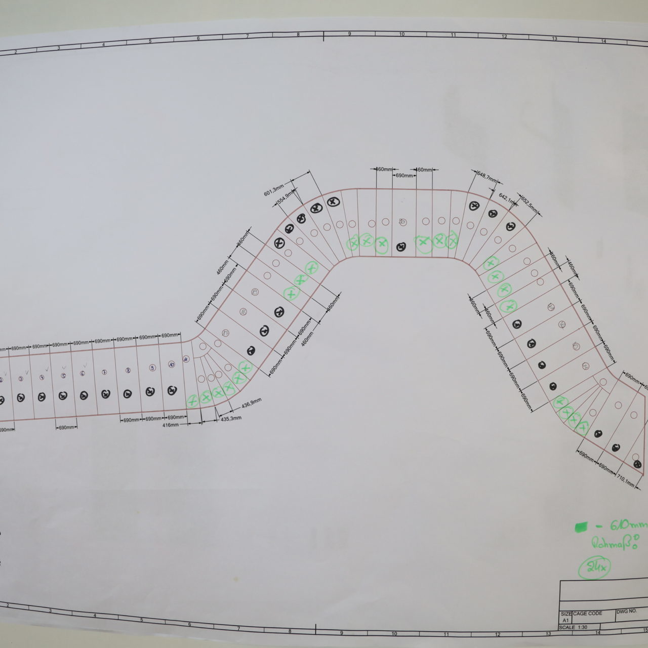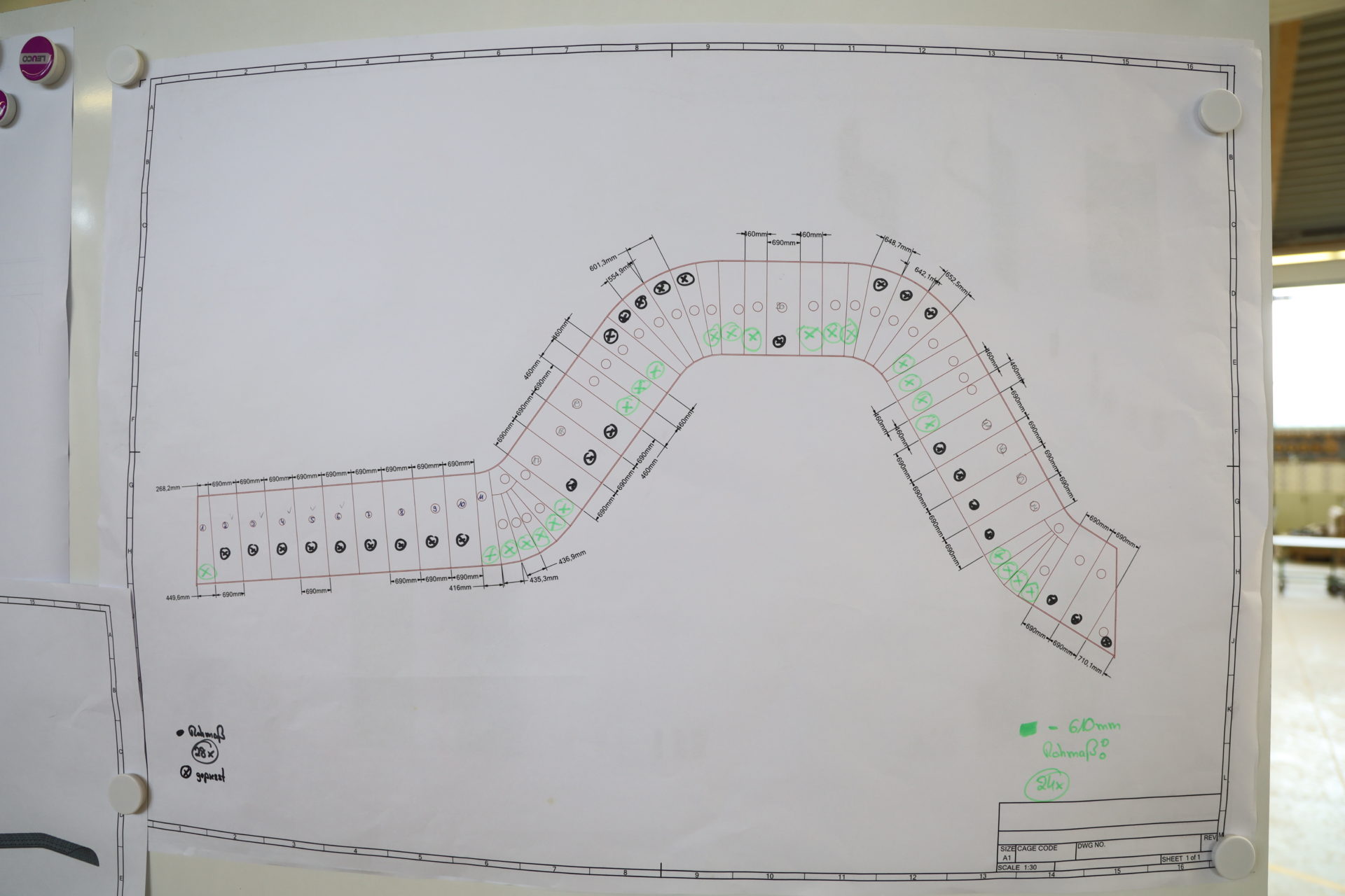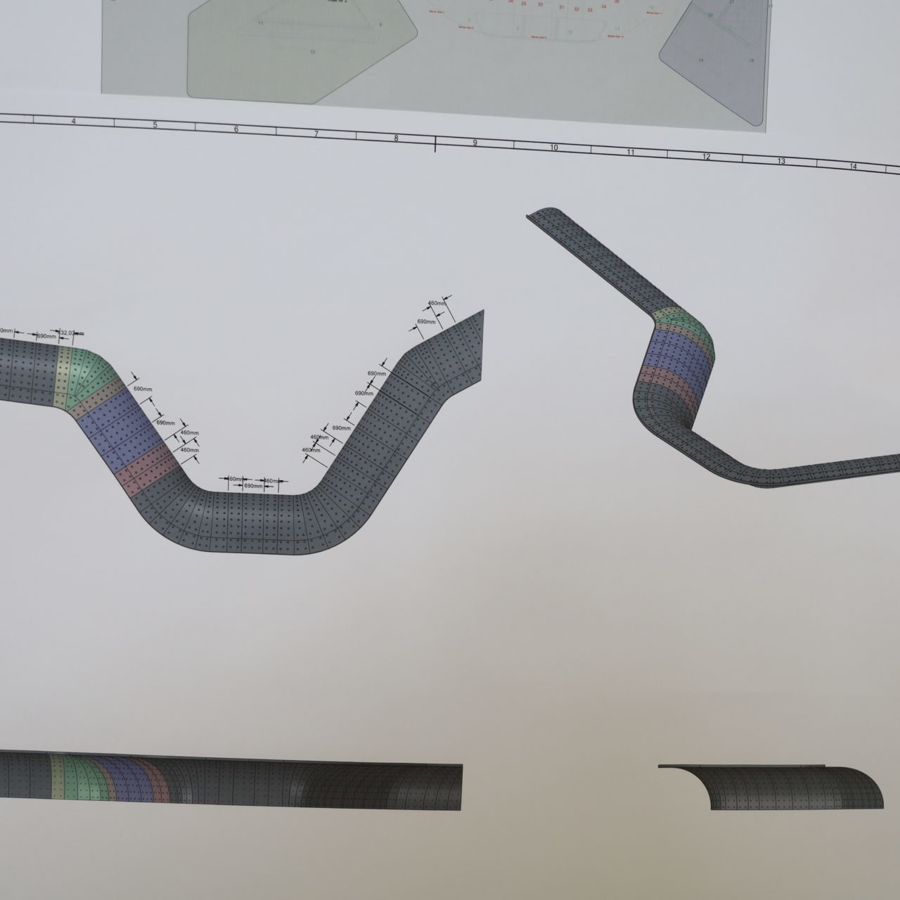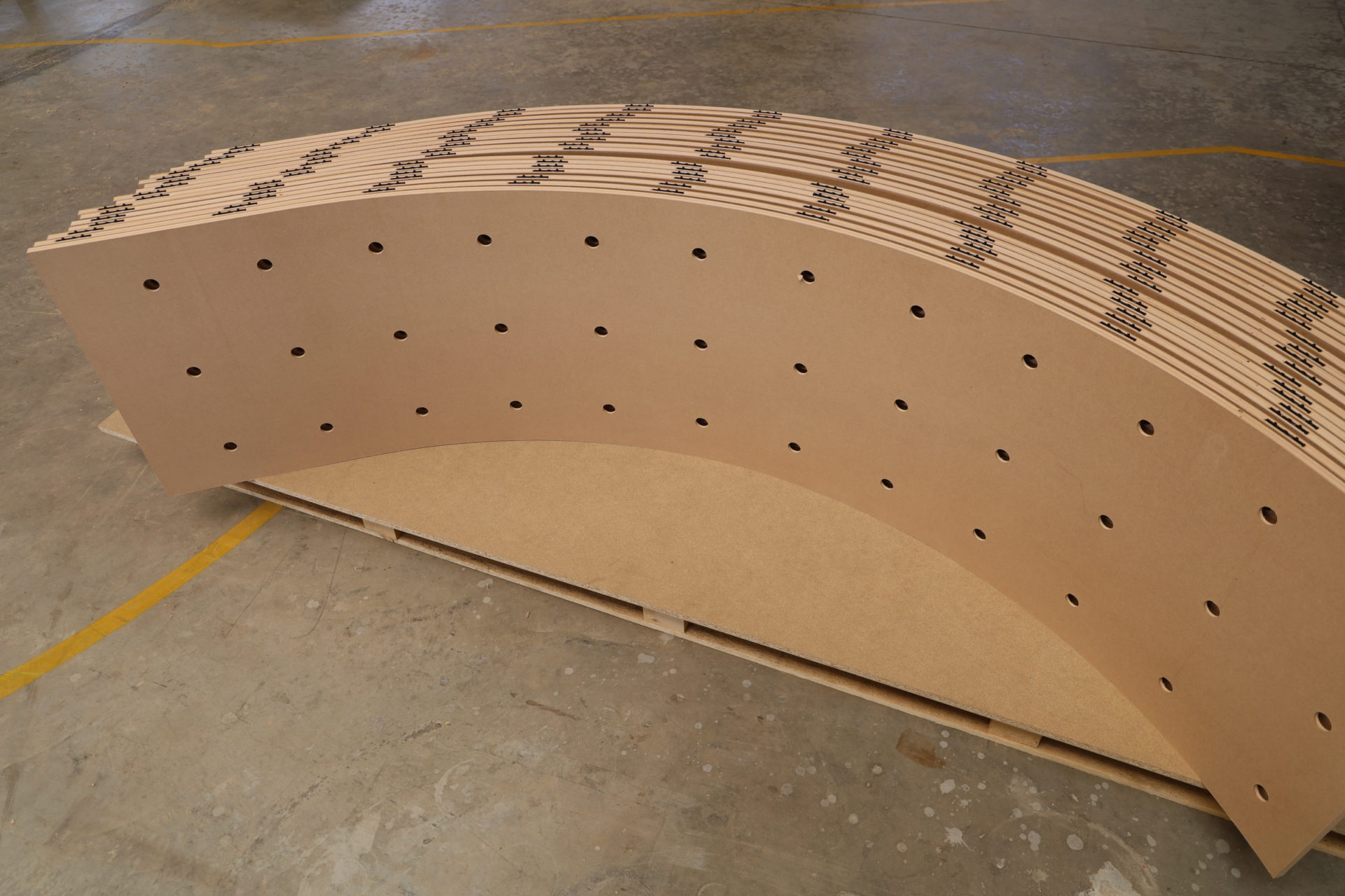 Holzviertelschalen verschiedenen Radien, Längen und mit und ohne Grundierfolie.