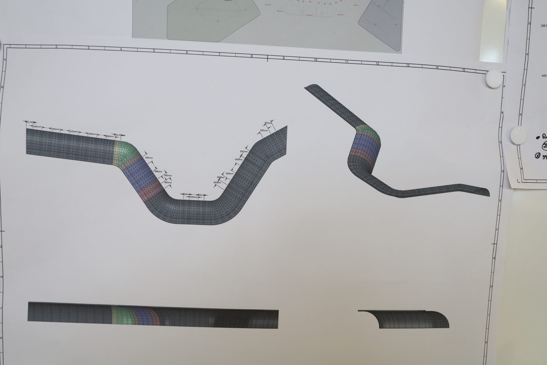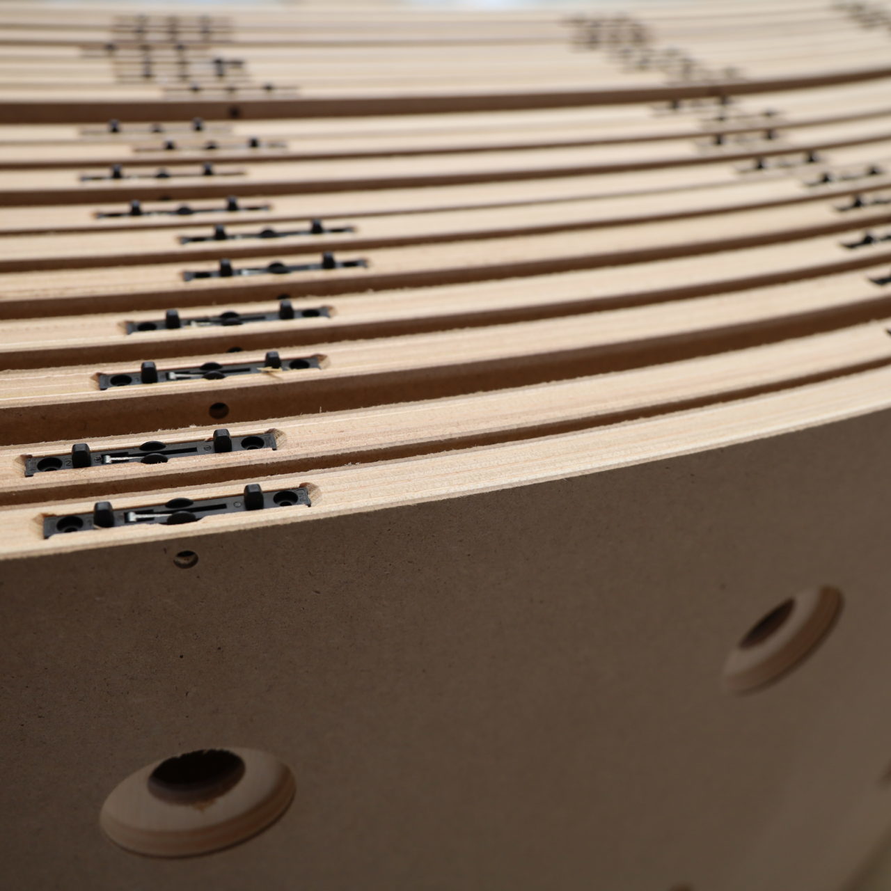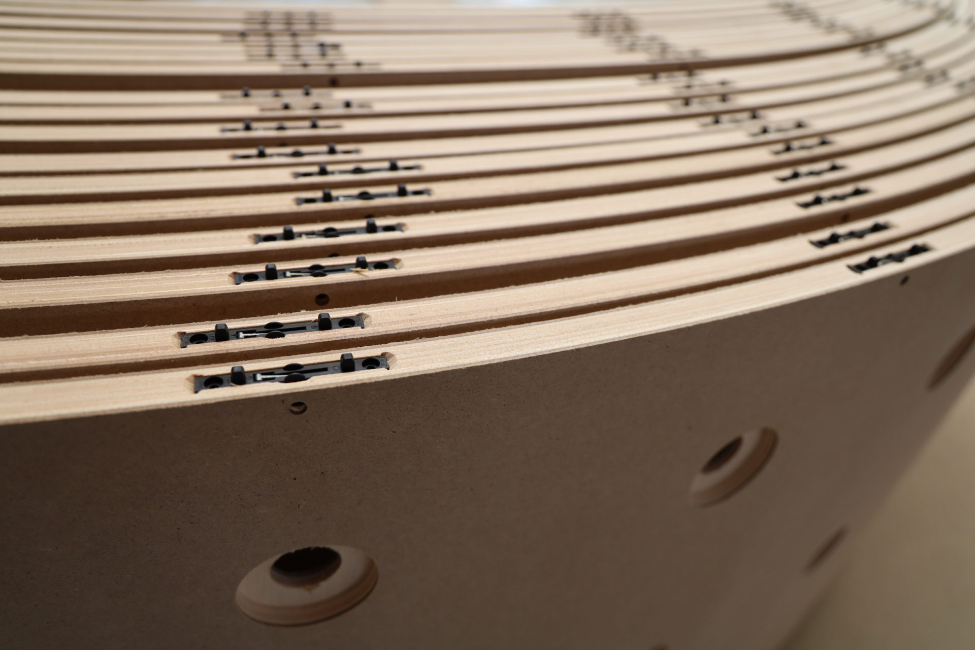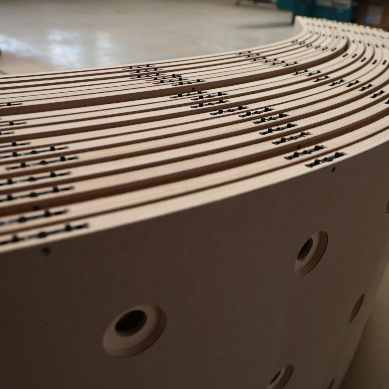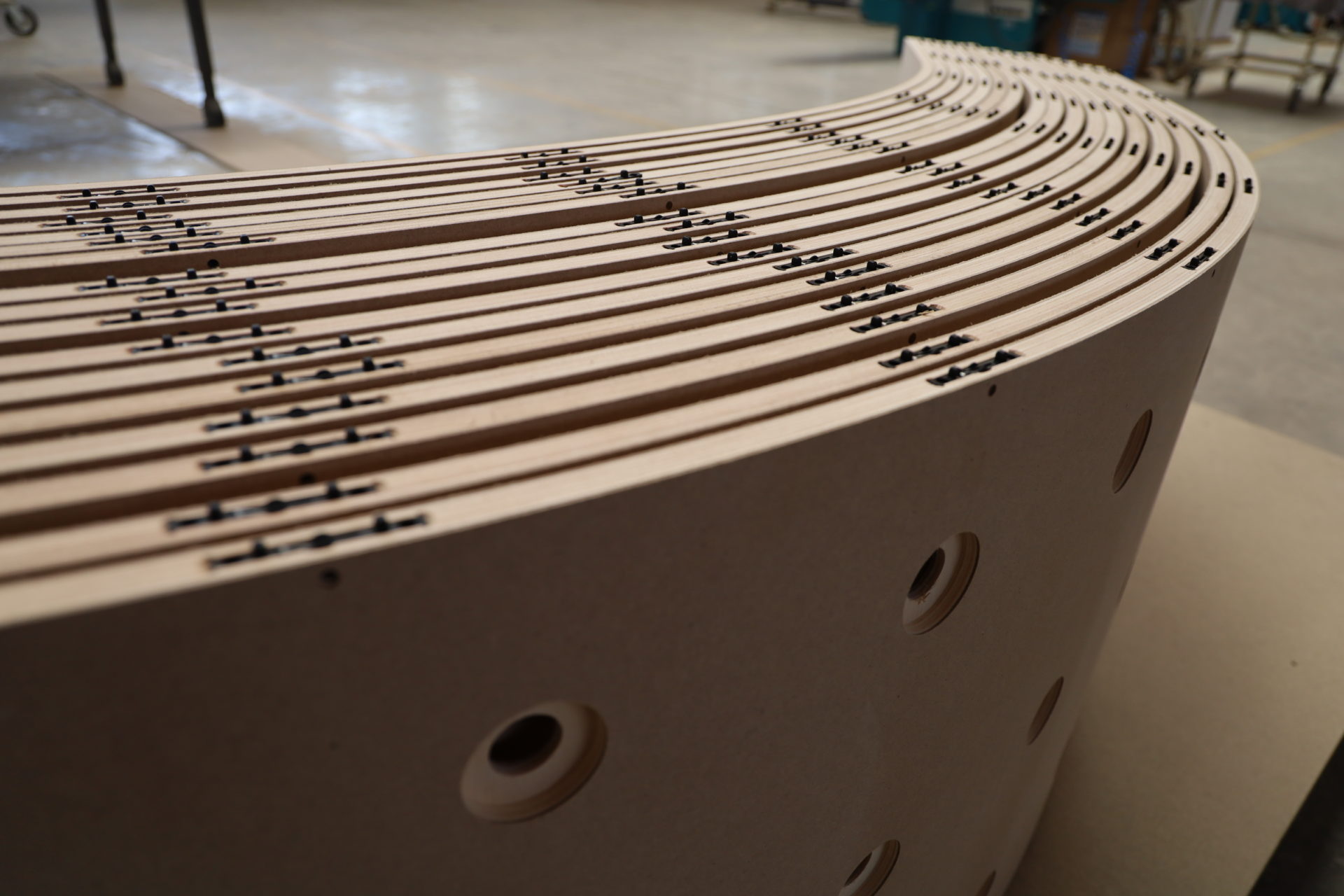 Holzhalbschalen verschiedenen Radien, Längen und mit und ohne Grundierfolie.