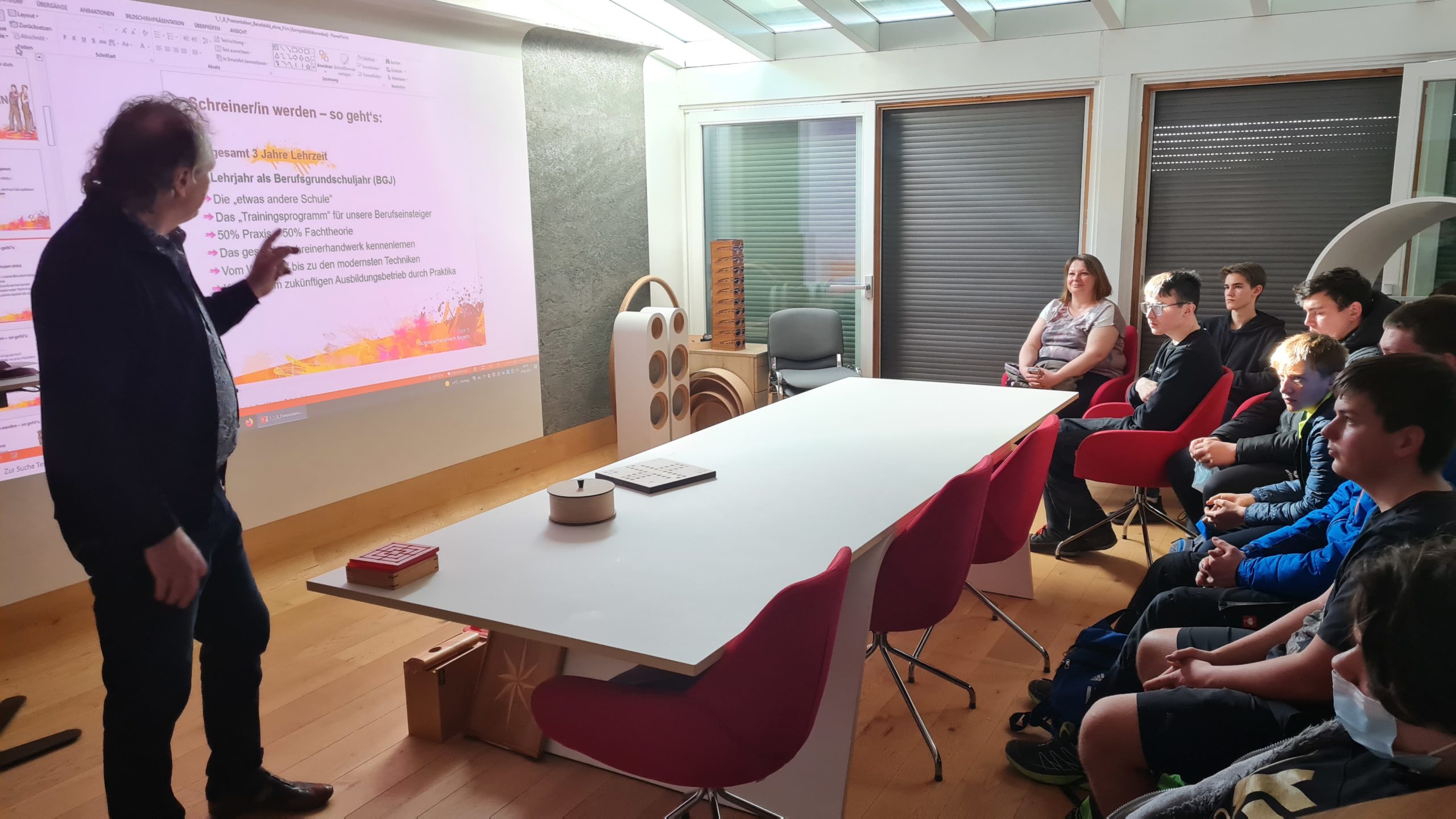 Schreinermeister und Geschäftsführer Rupert Niedermeier stellt hierbei in der rund dreistündigen Info-Veranstaltung die Ausbildung bei Holz in Form Niedermeier vor. Hier erfahren Schülerinnen und Schüler wichtiges über das Berufsbild des Schreiners, des Holzmechanikers und des technischen Produktdesigners Fachrichtung Holztechnik.