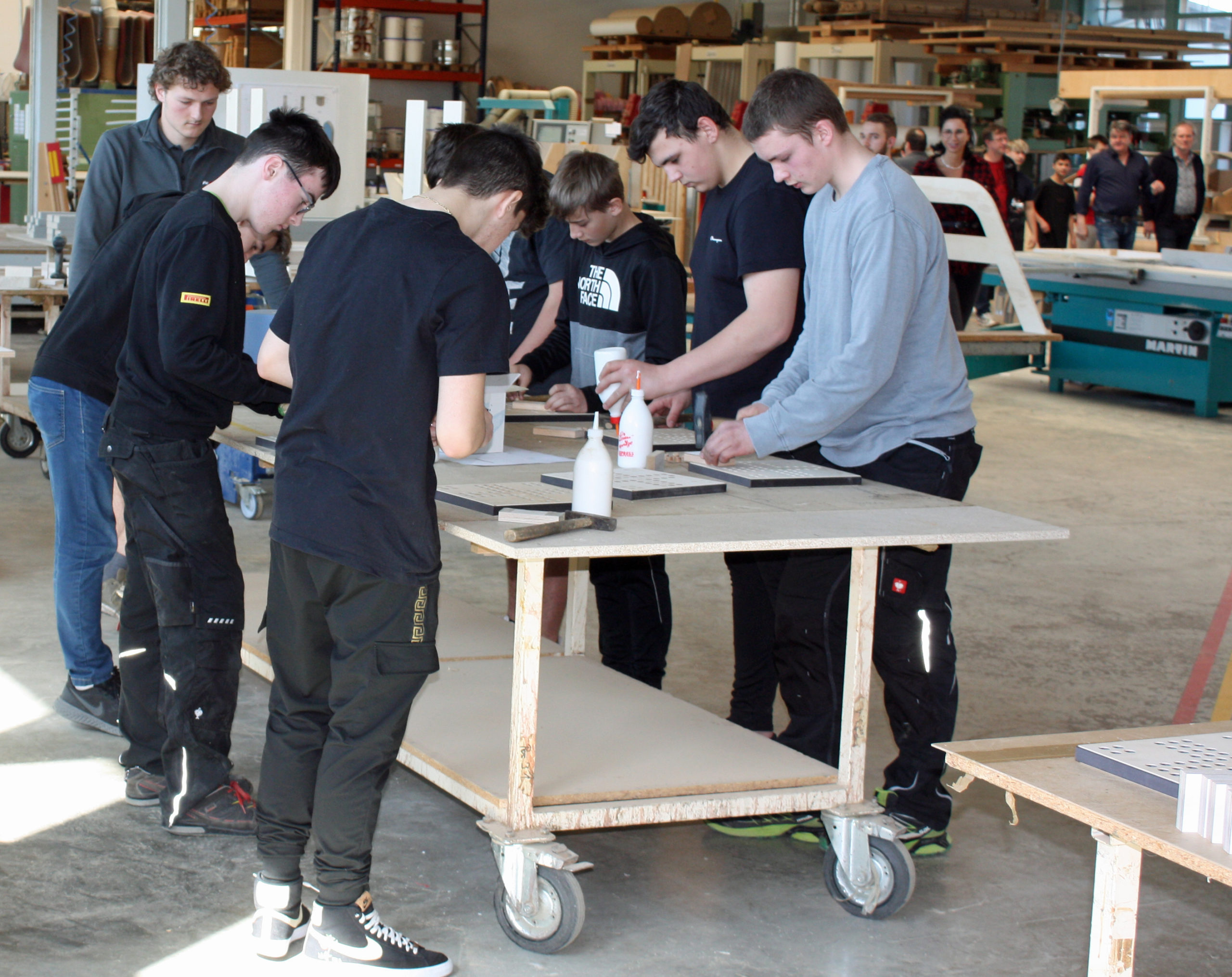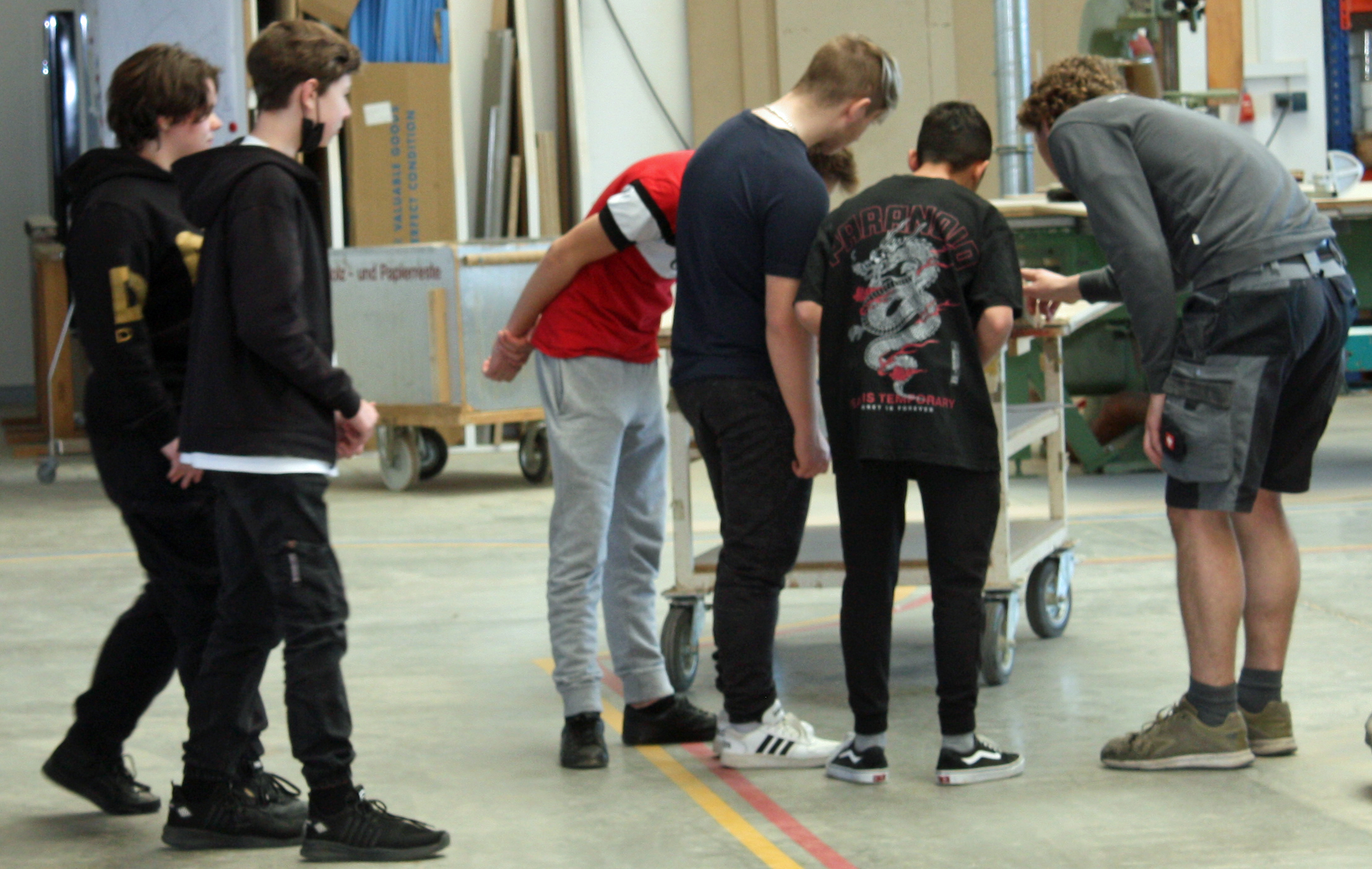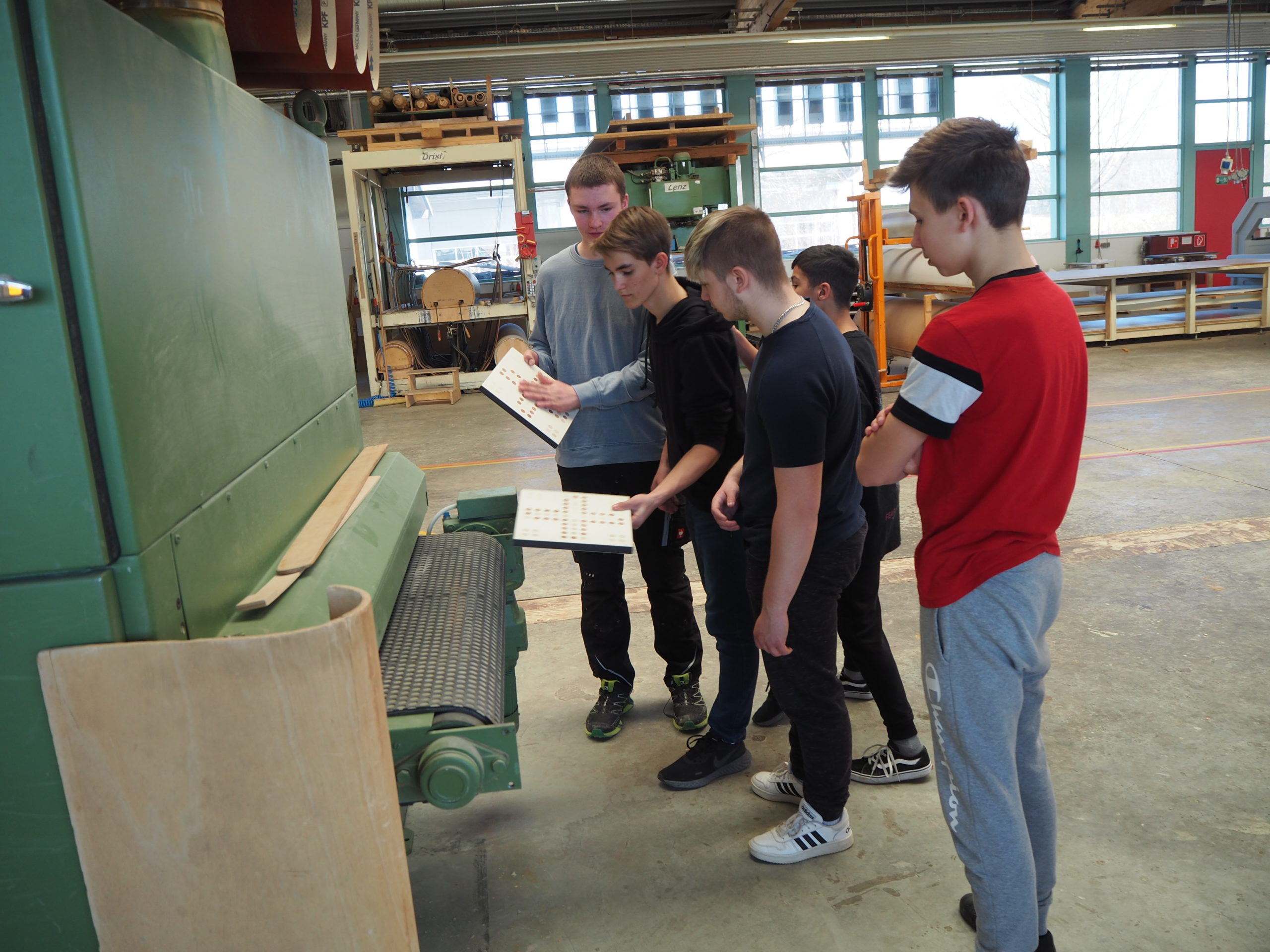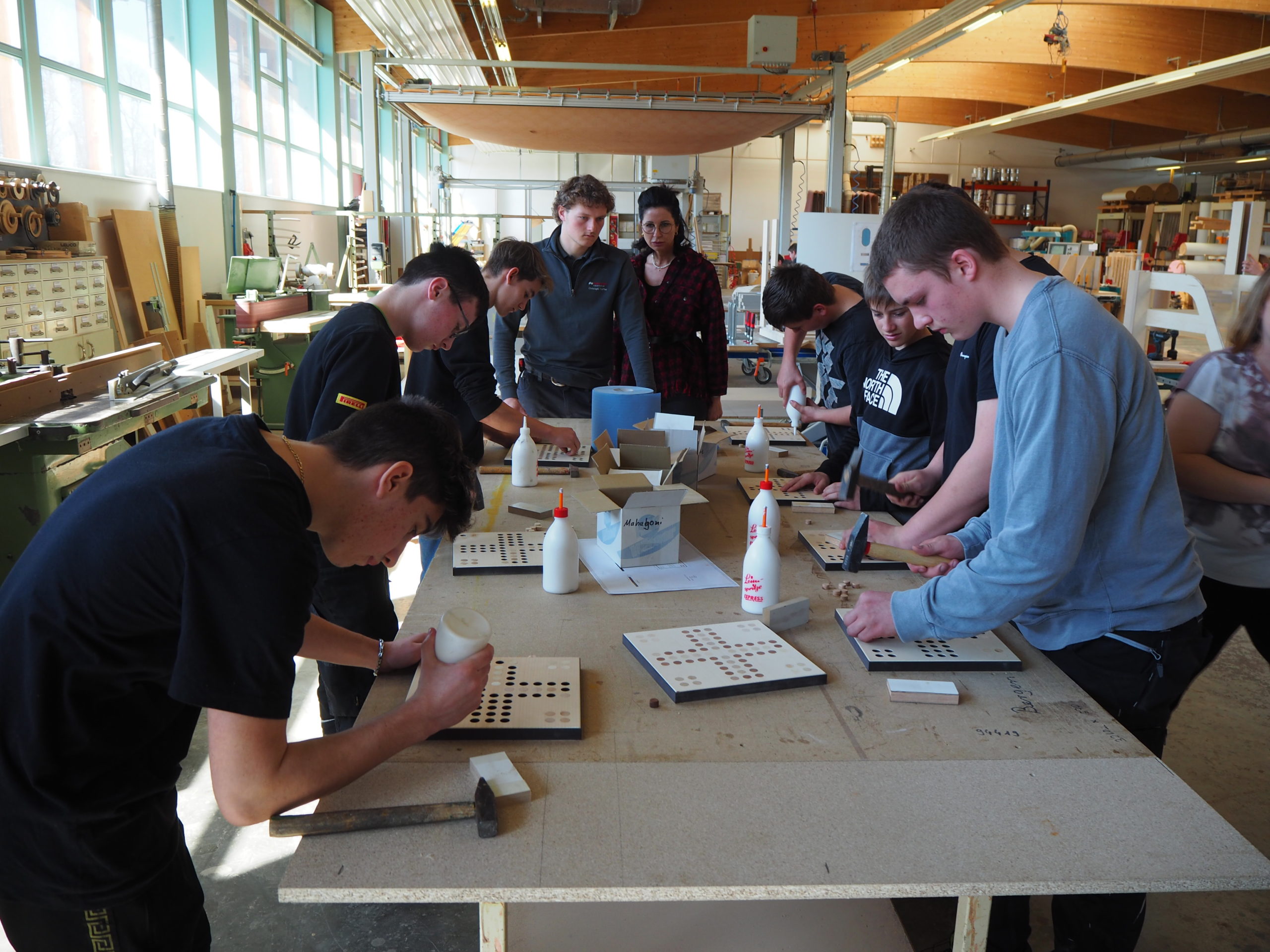 Beim Berufsinfotag haben Schülerinnen und Schüler aus den Berufsorientierungsklassen in der Schreinerei Holz in Form Niedermeier die Möglichkeit, Informationen zum Ausbildungsberuf als Schreiners zu erhalten.