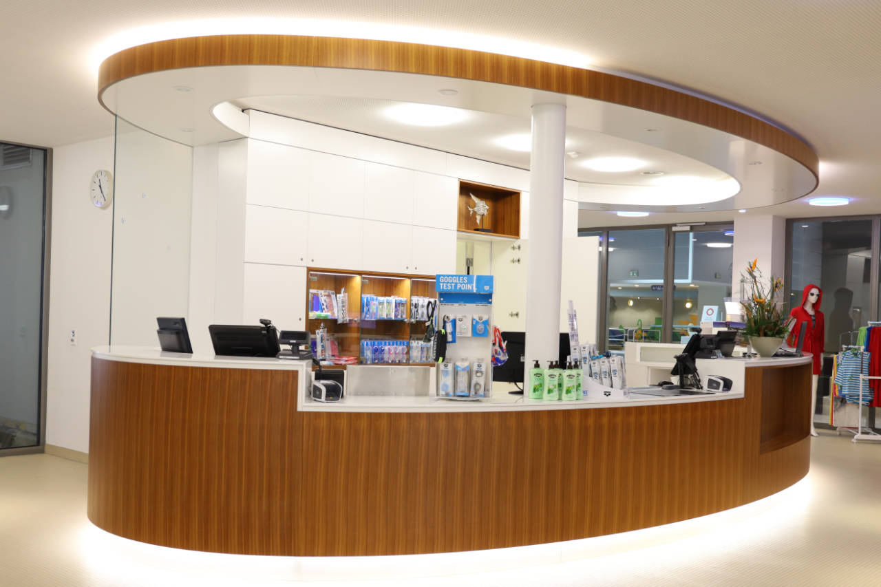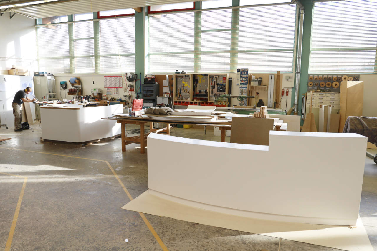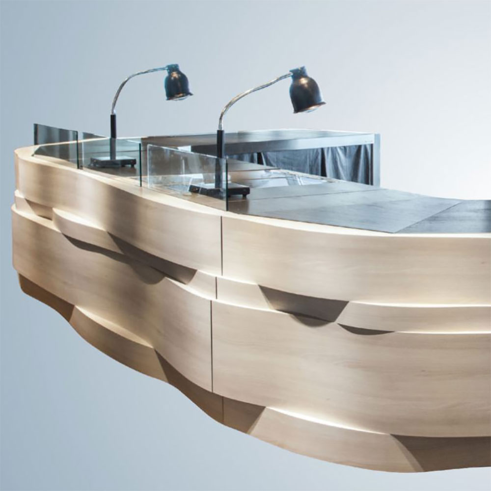 Runde Formen einzigartig in Szene gesetzt: Diese individuell auf Kundenwunsch gefertigten Premium-Holz Design-Theken lassen sich in repräsentativen Eingangsbereichen von Firmen-Zentralen, Hotels, Messen oder sonstigen hochwertigen Immobilien-Objekten präsentieren.