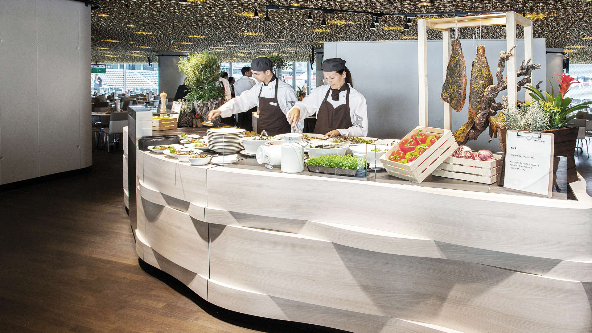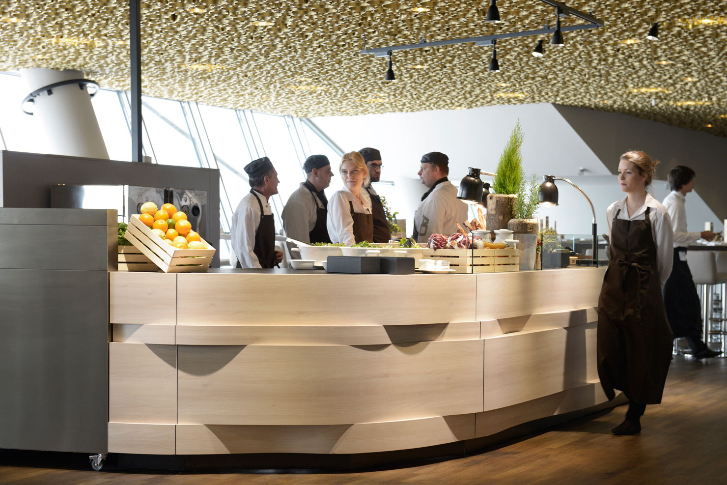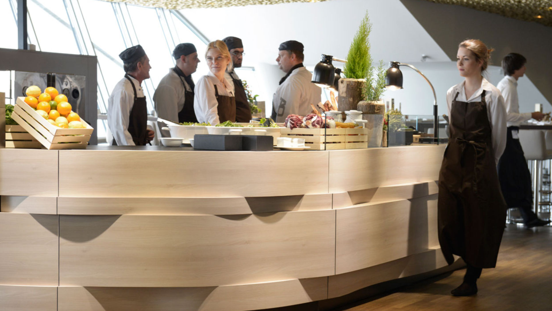 Runde Formen einzigartig in Szene gesetzt: Diese individuell auf Kundenwunsch gefertigten Premium-Holz Design-Theken lassen sich in repräsentativen Eingangsbereichen von Firmen-Zentralen, Hotels, Messen oder sonstigen hochwertigen Immobilien-Objekten präsentieren.
